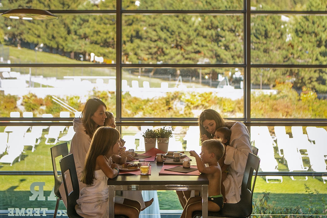 This comfortable hall allows you to take a break for a snack or a meal thanks to a handy self-service system. On the upper floor is possible to eat the food you have purchased enjoying a nice view of the Thermal Park, in the summertime also an open-air dining area is available.